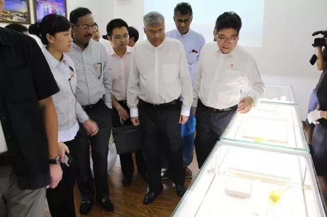 拉尼爾·維克拉馬辛哈總理一行參觀曙光恒升珠寶加工基地。汪主任介紹了基地利用黃金、鉆石、彩寶等加工情況。