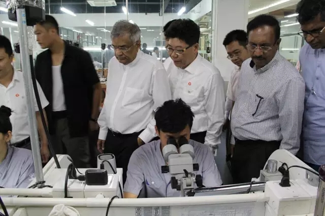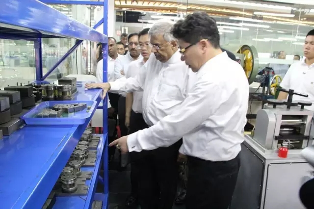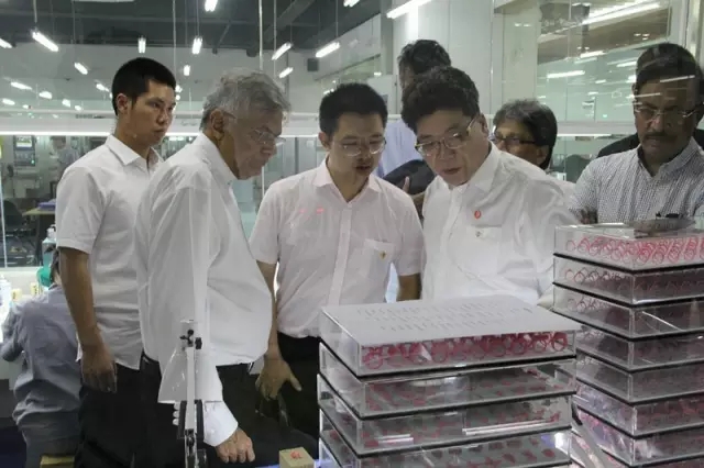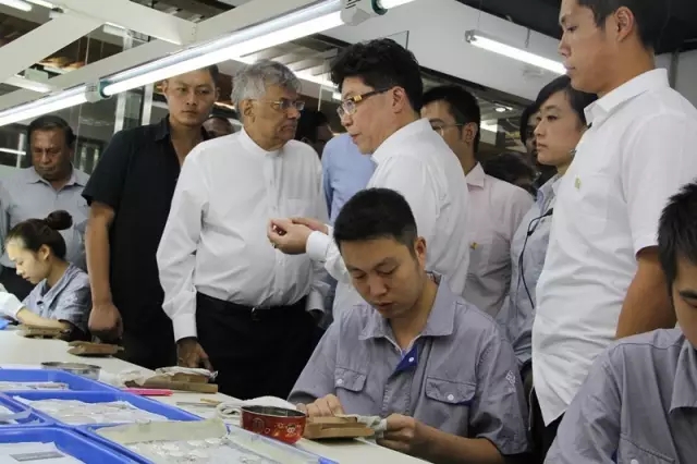 在自動(dòng)化CNC生產(chǎn)產(chǎn)品車間,汪總對(duì)產(chǎn)品工藝進(jìn)行介紹,拉尼爾·維克拉馬辛哈總理一行對(duì)工廠的產(chǎn)品仔細(xì)觀摩并與隨行人員討論。