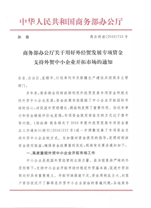 商務(wù)部辦公廳關(guān)于用好外經(jīng)貿(mào)發(fā)展專項(xiàng)資金支持外貿(mào)中小企業(yè)開拓市場的通知